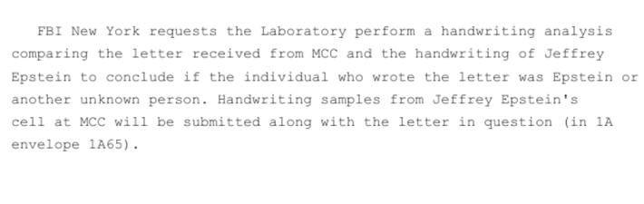 Another document posted on Tuesday reveals that the FBI asked its handwriting-analysis laboratory to examine the Epstein note in 2020: