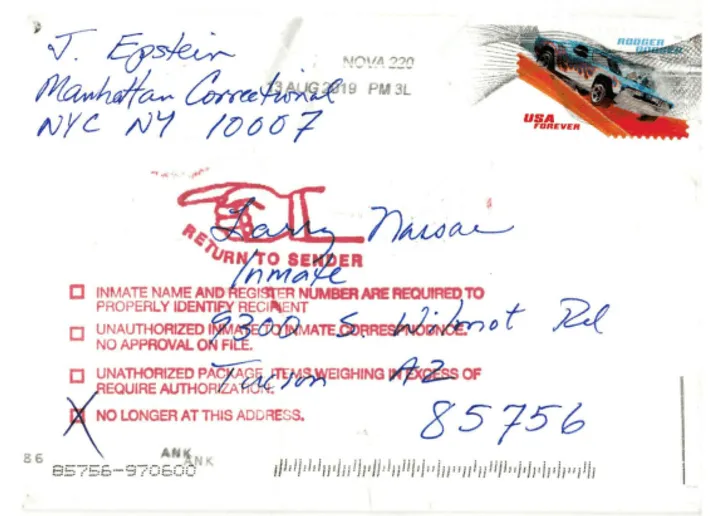 Epstein was found dead on August 10, 2019, and the letter was postmarked August 13, 2019. The envelope also has a Northern Virginia postmark, while Epstein was being held at the Metropolitan Correctional Center in Manhattan.