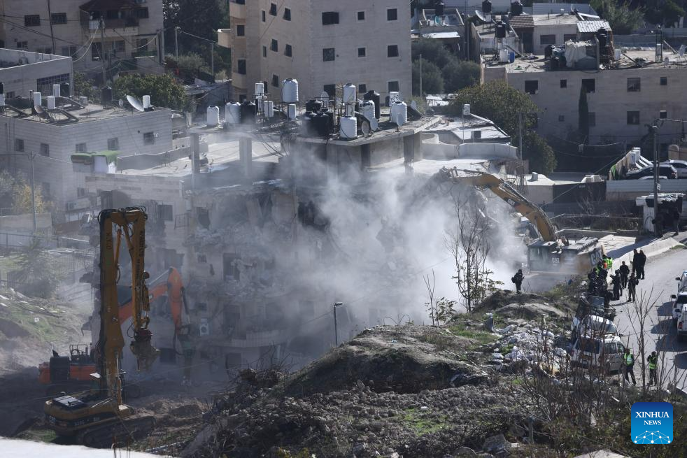 An excavator demolishes a residential building in the Silwan neighborhood of east Jerusalem, on Dec. 22, 2025. Israeli forces on Monday demolished a four-floor residential building in Silwan, a Palestinian neighborhood in east Jerusalem. The apartment building, home to about 90 Palestinian residents living in 13 residential units, was the largest residential structure demolished in the area this year, according to Israeli rights group Ir Amim. (Photo by Jamal Awad/Xinhua)