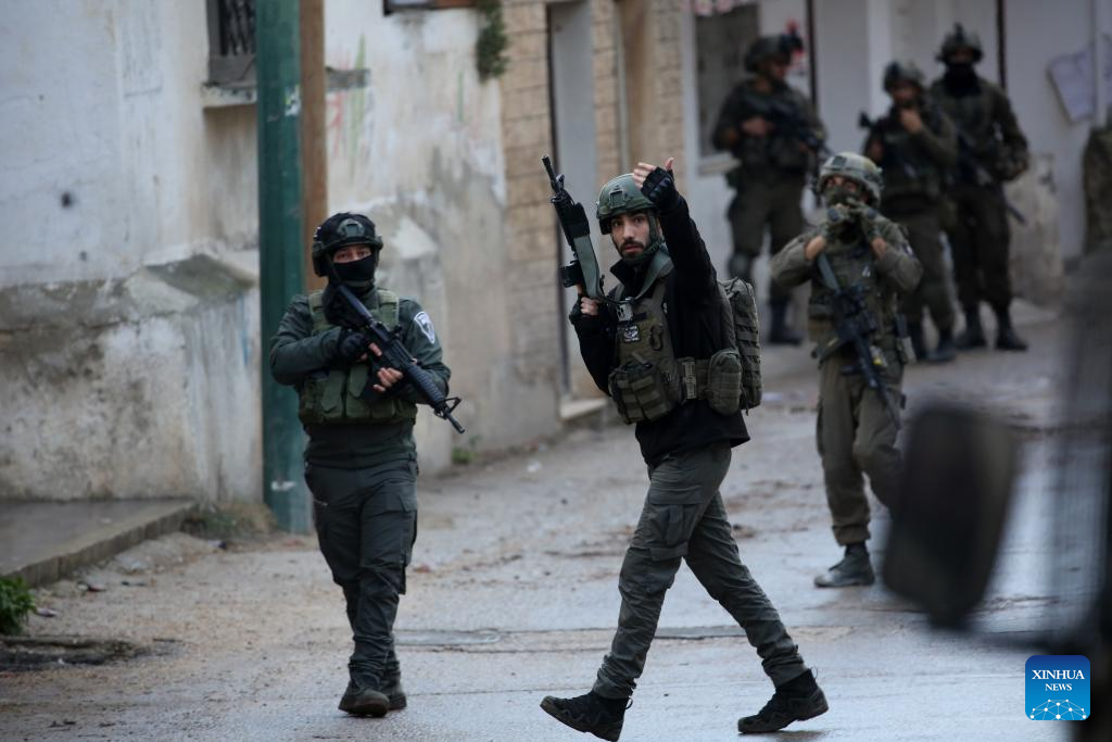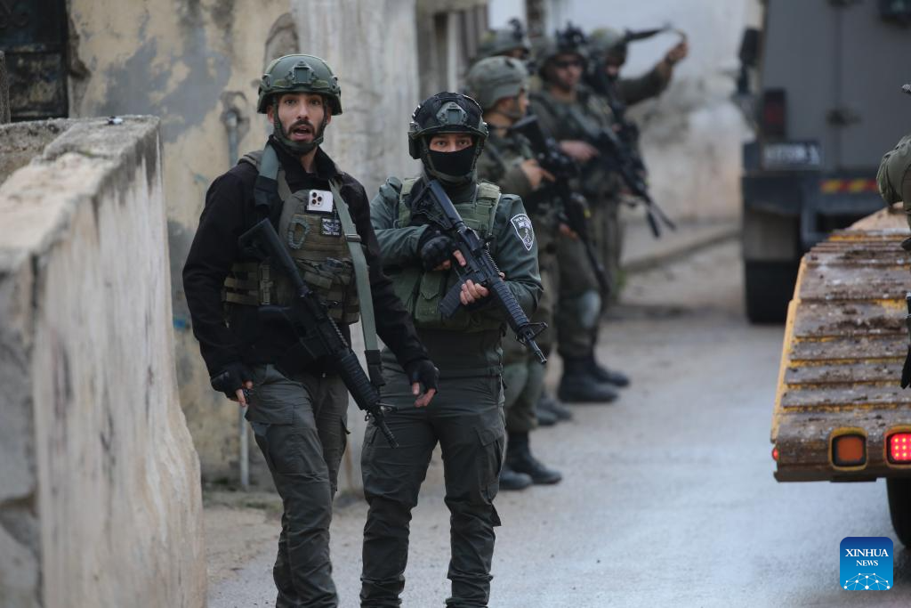 Members of Israeli forces stand guard as an Israeli bulldozer demolishes a house in the town of Bizzariya, northwest of Nablus in the West Bank, on Dec. 24, 2025. (Photo by Nidal Eshtayeh/Xinhua)