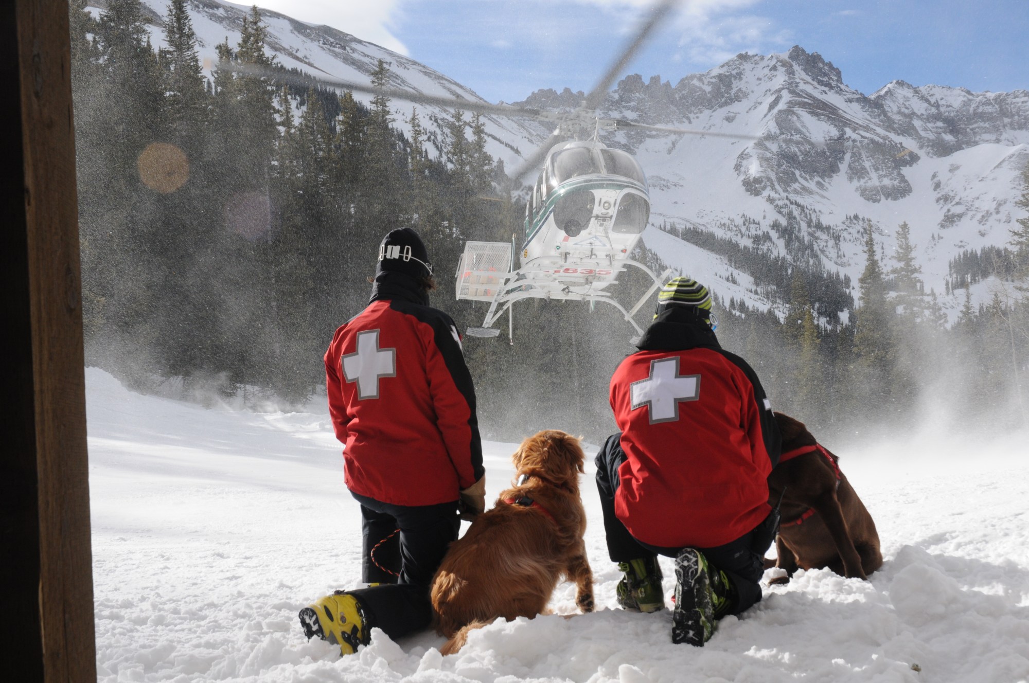 Telluride Ski Patrollers Jim Greene and Jason Rogers with their avalanche rescue dogs Jesse and Doris on a rescue exercise with Telluride Helitrax. (Brett Schreckengost, Special to The Colorado Sun)