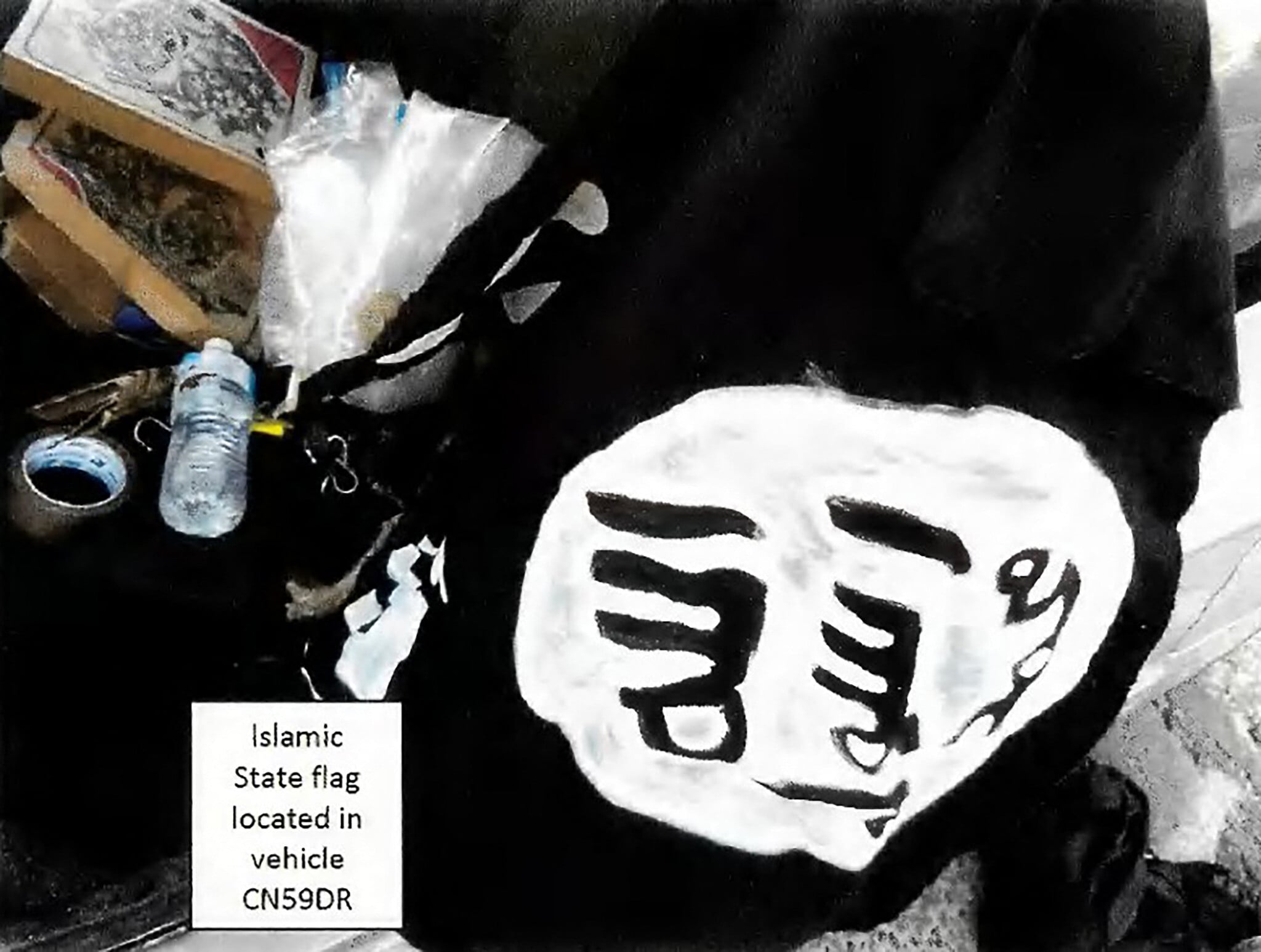 This handout photo from a court exhibit released by the NSW Courts as part of the police fact sheet on December 22, 2025, shows a general view of a home-made painted Islamic State (ISIS) flag, appearing to be made with white paint on black fabric, located in the vehicle CN59DR, registered to Naveed Akram, in Sydney. (Handout / NSW Courts / AFP)