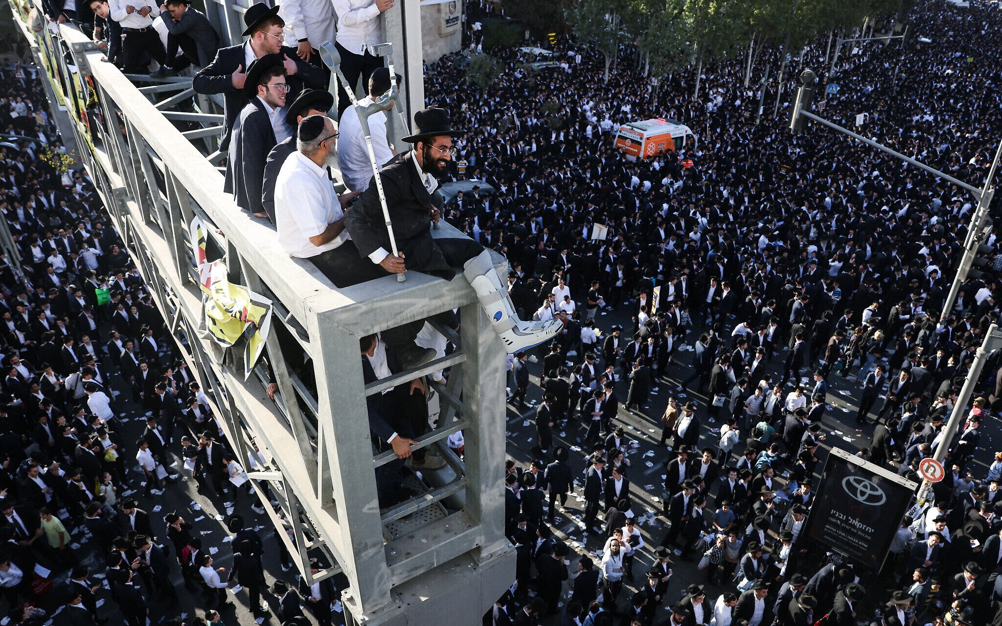 Ultra-Orthodox men sit on a bridge overlooking the crowd during a protest by ultra-Orthodox Jews against conscription into Israel’s military in Jerusalem on October 30, 2025. (AHMAD GHARABLI / AFP)
