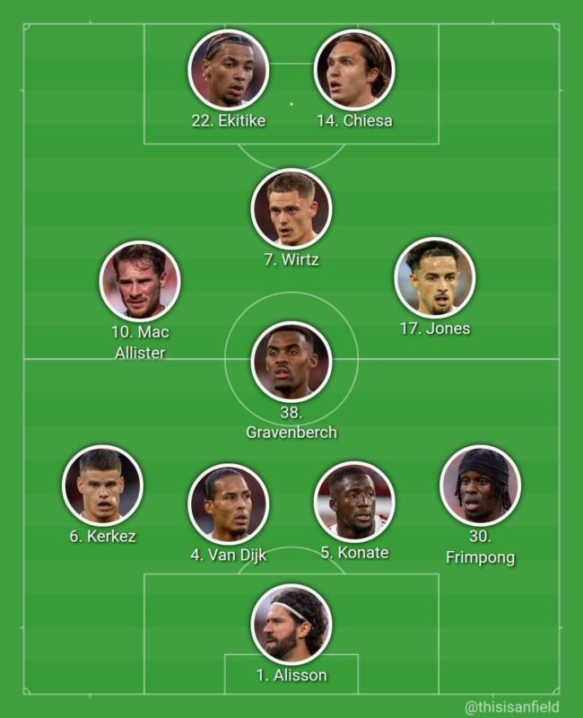 Liverpool: Alisson; Frimpong, Konate, Van Dijk, Kerkez; Gravenberch, Jones, Mac Allister; Chiesa, Wirtz, Ekitike