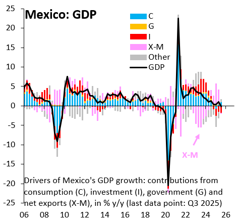 The reasons for Mexico’s stagnation are complex, but what’s clear is that the lack of growth should at this point be regarded as a structural problem. For some reason, the gains from globalization – Mexico’s exports to the US are doing extremely well – are not benefitting the broader population, which is why private consumption stagnates. This is is the basic problem. The gains from trade aren’t benefitting enough people.