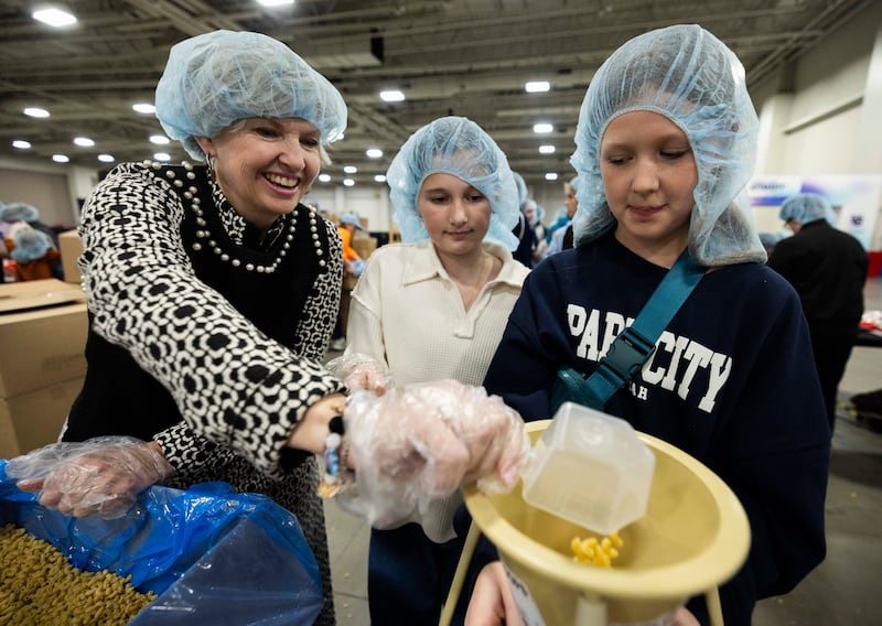 1 million meals in UtahYoung Women General President Emily Belle Freeman, left, prepares bags of meals with Brielle Briggs, 12, center, and Arianna Nopper, 11, right, during a service project organized by The Church of Jesus Christ of Latter-day Saints and Silicon Slopes to help assemble 1 million meals for the Utah Food Bank, in the Salt Palace Convention Center in Salt Lake City on Tuesday, Jan. 14, 2025. | Brice Tucker, Deseret News