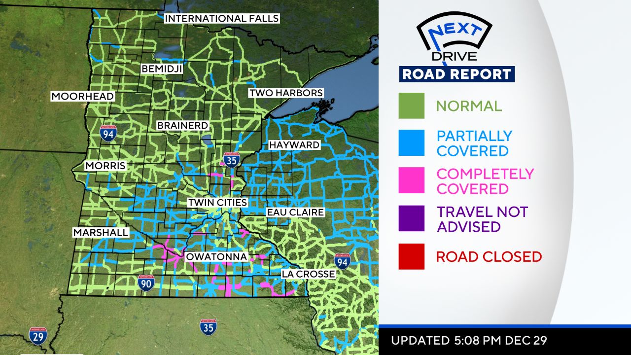 A NEXT Drive Alert and no-travel advisory that were in place during the morning commute have since been lifted. According to the Minnesota Department of Transportation, most Twin Cities roads are normal or partially covered. Conditions are worse, but improving, in central and southern Minnesota.