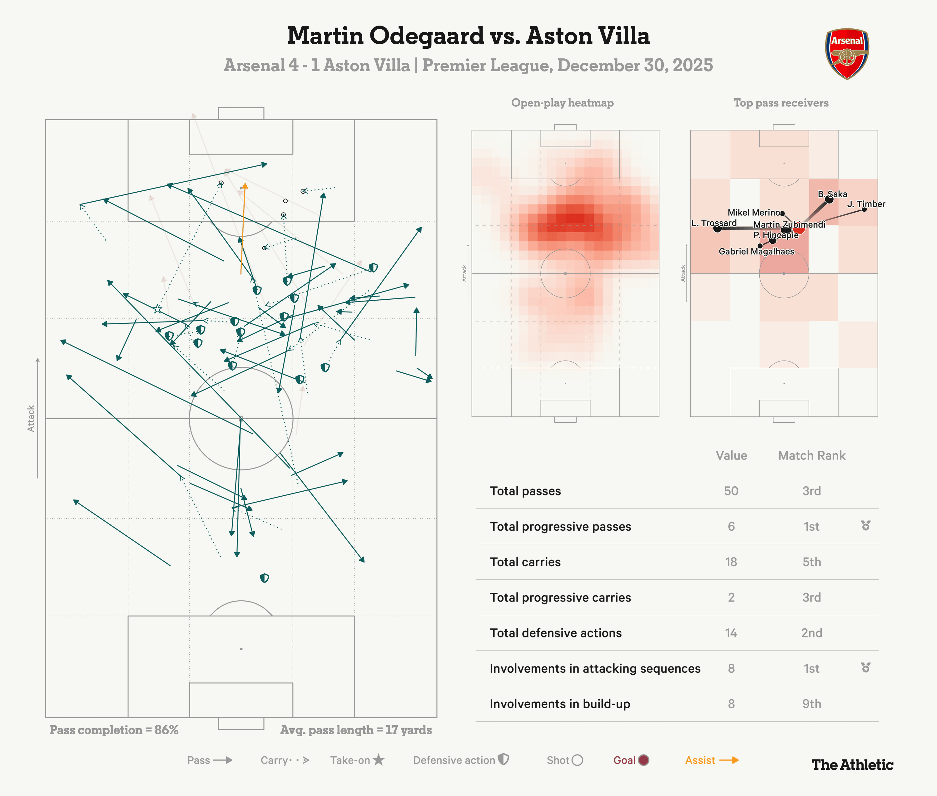 Odegaard drifted to the left to receive a pass from Piero Hincapie and instantly turned it onto Zubimendi, operating on the left. Zubimendi knocked it past a weak tackle from Andres Garcia before finding Trossard, who fed Jesus. It required a stunning finish from the edge of the box and capped off an Arsenal move that went from Raya to the back of Villa’s net in 22 seconds.