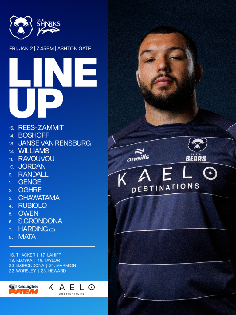 Bristol Bears team to face Sale Sharks at Ashton Gate on Friday night in Gallagher PREM round nine (7.45pm KO, live on TNT Sports):