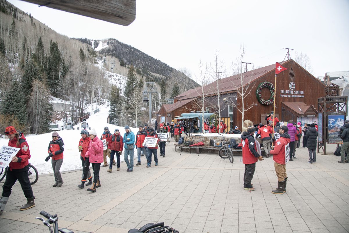 Members of the Telluride Professional Ski Patrol Association march near the Telluride gondola station during their first day of a work stoppage strike in downtown Telluride on Dec. 27, 2025. (William Woody, Special to The Colorado Sun)