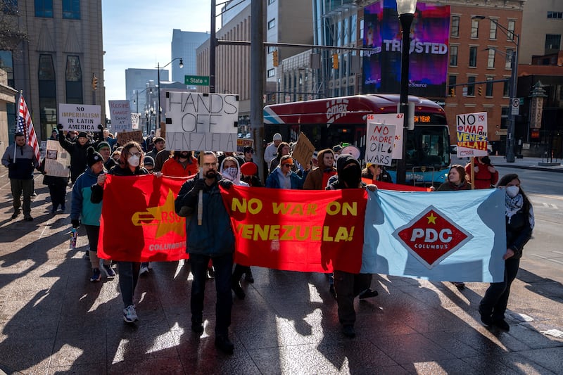 Protesters rally in front of the Ohio Statehouse in Columbus, Ohio, on Sunday, Jan. 4, 2026, after the U.S. captured Venezuelan President Nicolás Maduro and his wife in a military operation. (AP Photo/Jessica Phelps) Protesters rally in front of the Ohio Statehouse in Columbus, Ohio, on Sunday, Jan. 4, 2026, after the U.S. captured Venezuelan President Nicolás Maduro and his wife in a military operation. (AP Photo/Jessica Phelps) (Jessica Phelps/AP)