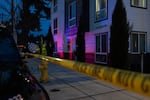 The remnants of a blood stain mark the sidewalk at Bria Apartments in Portland, Ore., on Jan. 9, 2026.