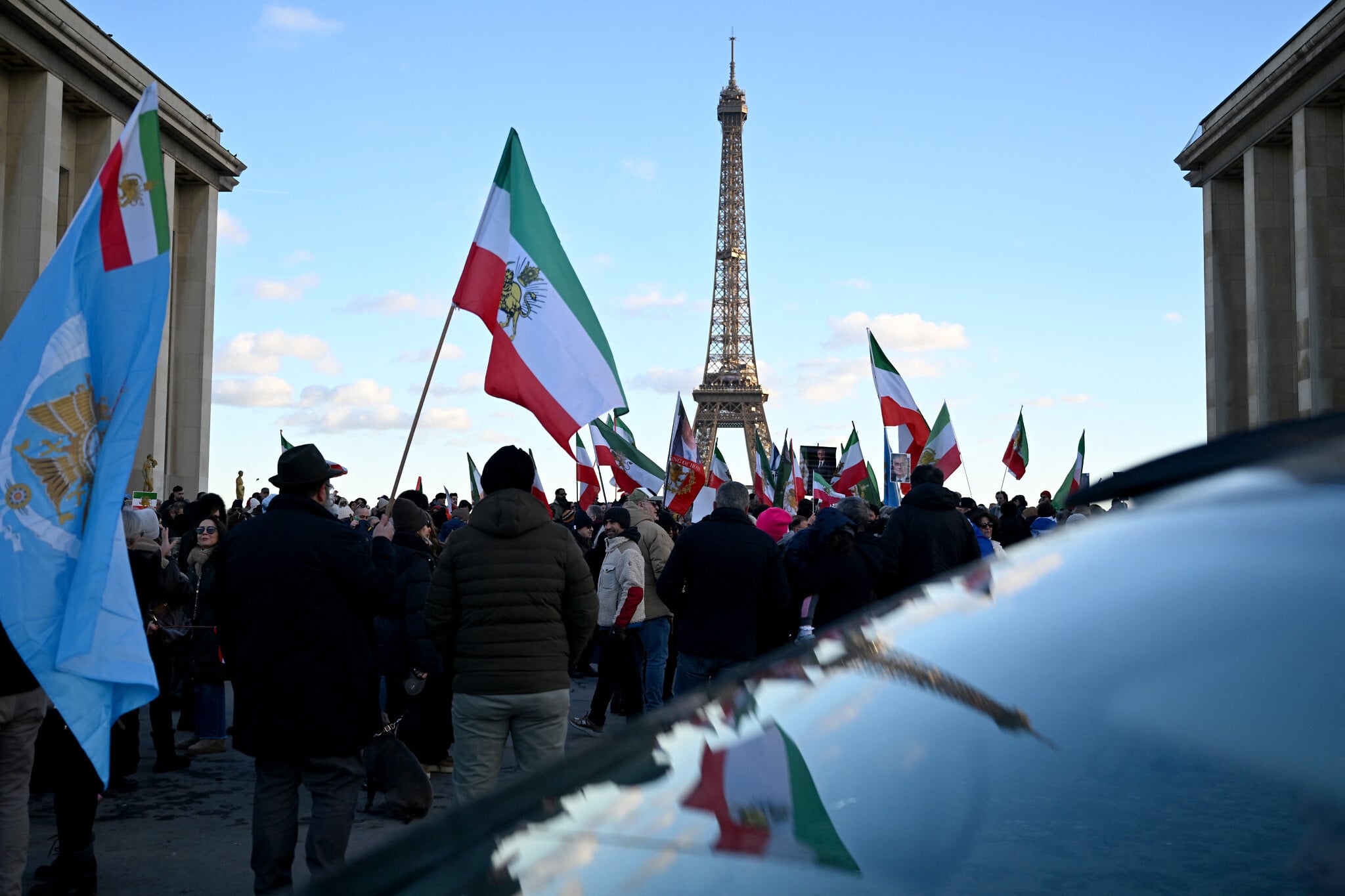 Protesters wave the national flag of Iran as they gather for a demonstration against the Iranian regime’s crackdown on protests, in central Paris, on January 4, 2026. (Blanca Cruz / AFP)