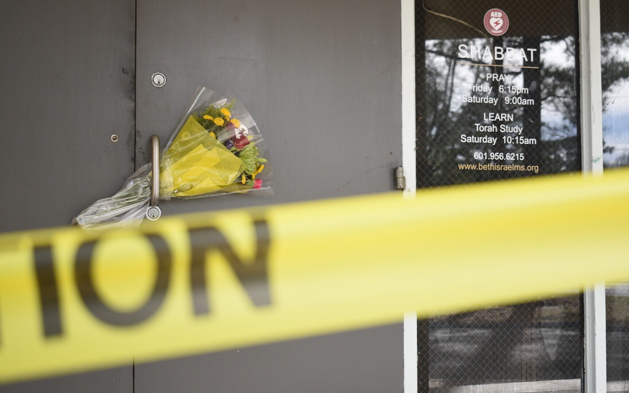 Caution tape and flowers cover the entrance to the Beth Israel Congregation, a synagogue that was set on fire, January 12, 2026, in Jackson, Mississippi. (AP Photo/Sophie Bates)