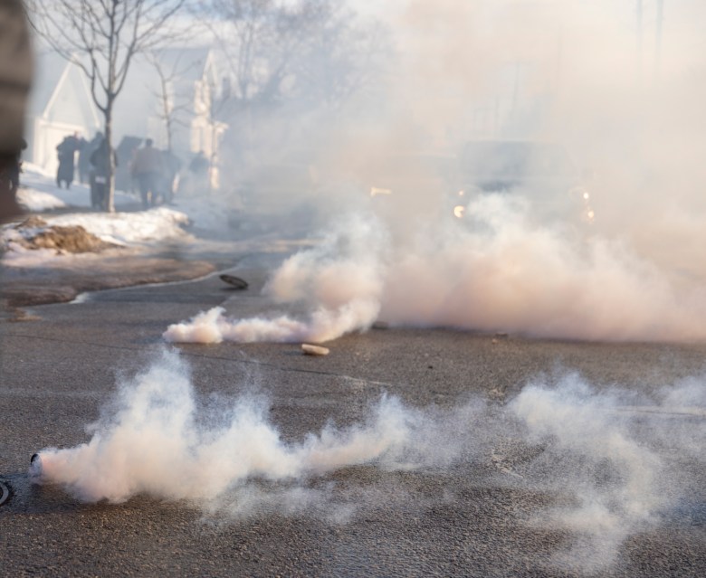 Tear gas is deployed at the corner of 34th and Oakland in Minneapolis on Jan 13, 2026. Credit: Chris Juhn for Sahan Journal