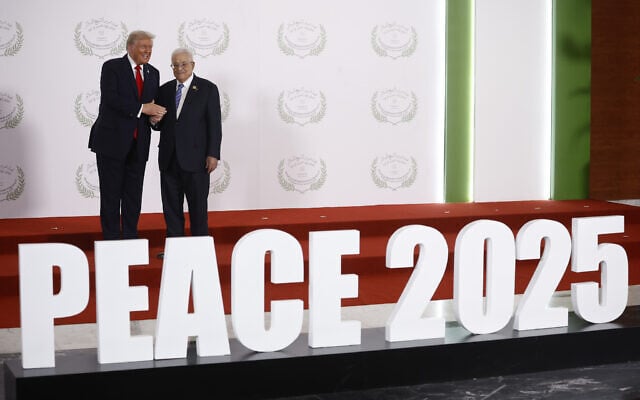 President Donald Trump and Palestinian President Mahmoud Abbas pose at the Gaza Peace Summit in Sharm el-Sheikh, Egypt, Monday, Oct.13 2025. (Yoan Valat, Pool photo via AP)