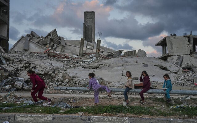 Palestinians girls play amid buildings destroyed by Israeli air and ground operations in the Zeitoun neighborhood of Gaza City, Wednesday, Jan. 14, 2026. (AP Photo/Jehad Alshrafi)