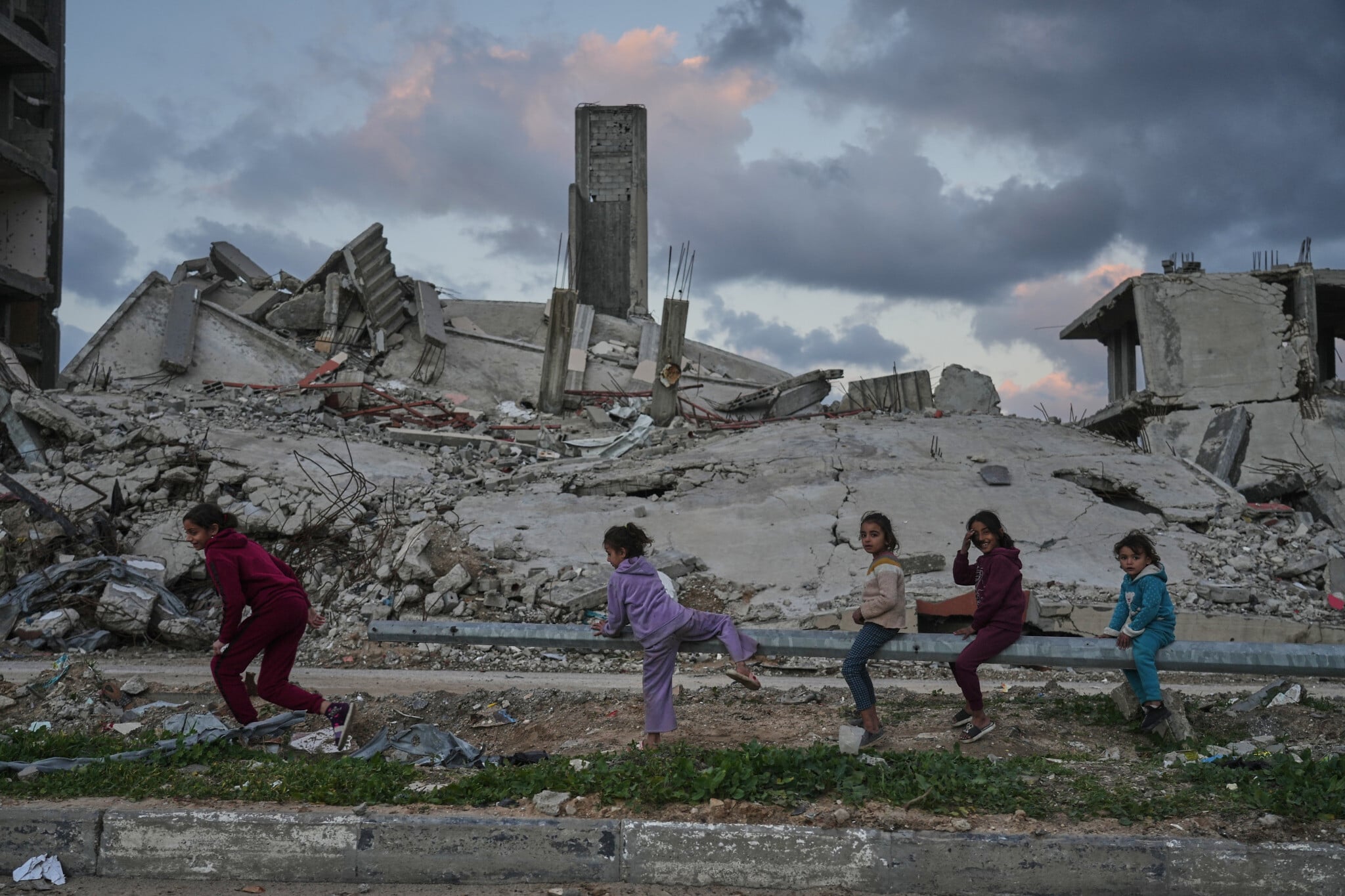 Palestinians girls play amid buildings destroyed by Israeli air and ground operations in the Zeitoun neighborhood of Gaza City, Wednesday, Jan. 14, 2026. (AP Photo/Jehad Alshrafi)