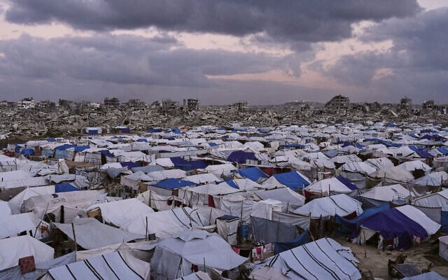 A tent camp for displaced Palestinians stretches across the Zeitoun neighborhood of Gaza City, January 14, 2026. (AP/Jehad Alshrafi)