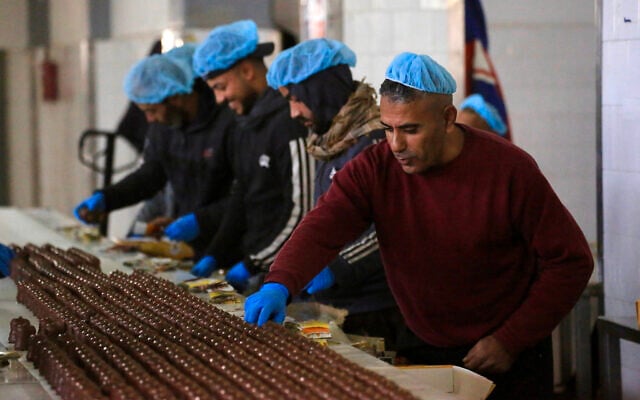 Palestinian workers inspect sweets locally known as “al-Shatwi” (Winter) Crimbo sweets, as the Al-Arees factory gradually resumes operation following the Gaza war, which led to shortages of raw materials used in their products, in Deir al-Balah, in the central Gaza Strip, January 12, 2026. (Bashar Taleb / AFP)