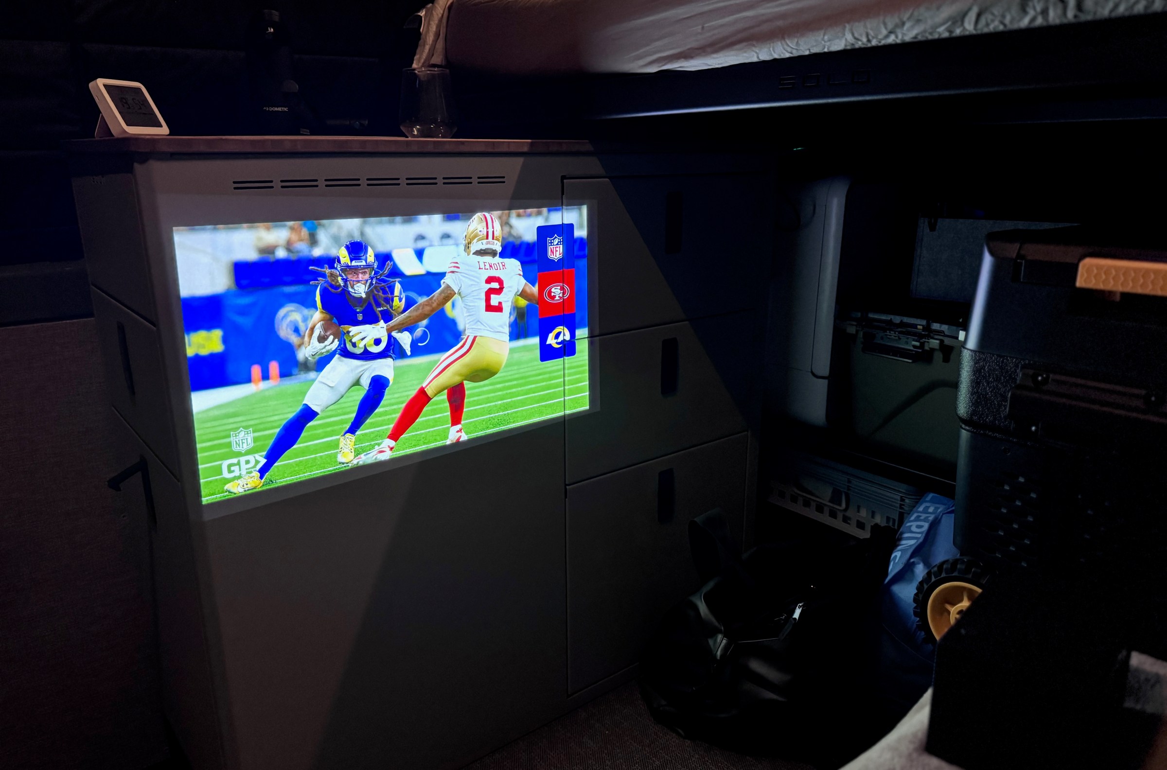 Watching an NFL game streamed over the DAZN app inside my van at night.