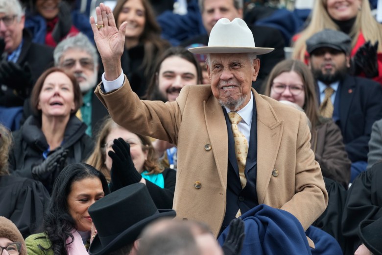 Former Gov. Douglas Wilder waves during Virginia Gov. Abigail Spanberger’s inaugural ceremonies at the Capitol in Richmond Saturday. Photo by Steve Helber, Associated Press, pool.