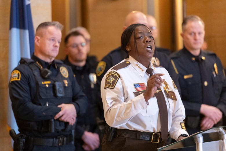 Hennepin County Sheriff DeWanna Witt speaks at a news conference at the State Capitol on Jan. 20, 2026, saying federal agents are eroding trust with the public. Credit: Chris Juhn for Sahan Journal