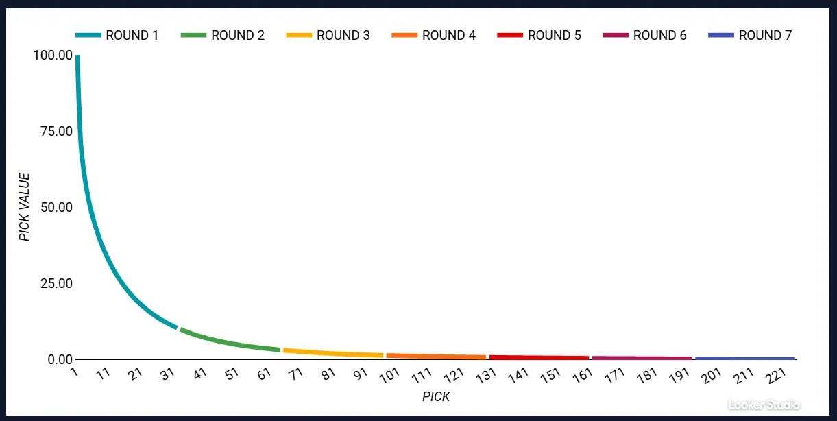 At first, the distinctions are sharp. The value of the first overall pick is set at 100, and by pick two, we’re down to 72.69, and by pick three, down to 62.07. But the curve smooths out eventually. As one can see, there’s a noticeable tapering off of value that occurs toward the end of the first round and into the beginning of the second round. A flattening, or plateauing, if one will.