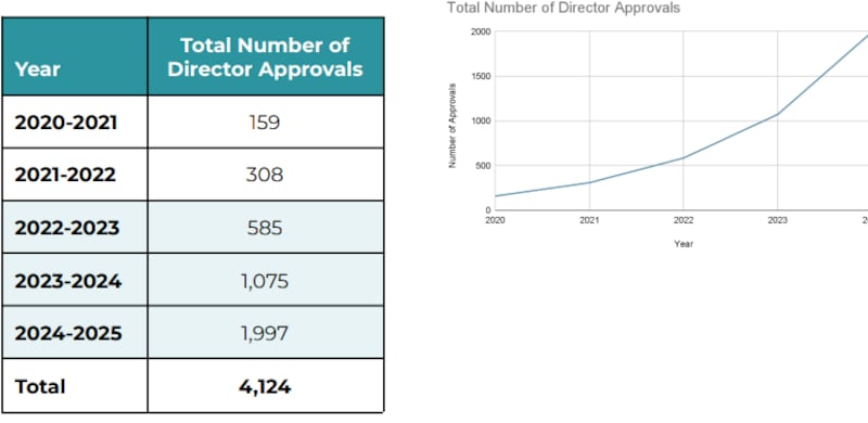 The data showed that the number of director approvals in Ontario has risen from 159 in 2020-2021 to 1,997 in 2024-2025, a staggering 1,156 per cent increase.