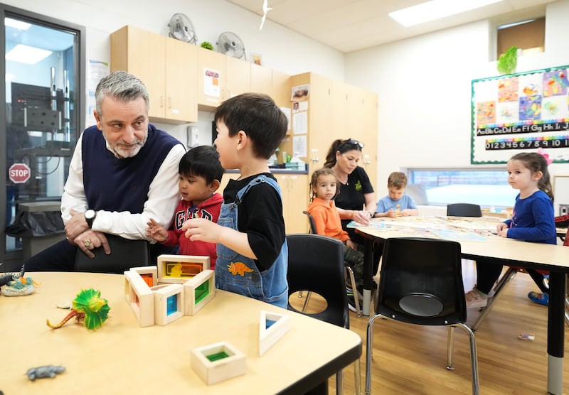 PC Paul Calandra visits children at the Blessed Chiara Badano Child Care Centre in Stouffville, Ont., Friday, May 2, 2025. THE CANADIAN PRESS/Nathan Denette