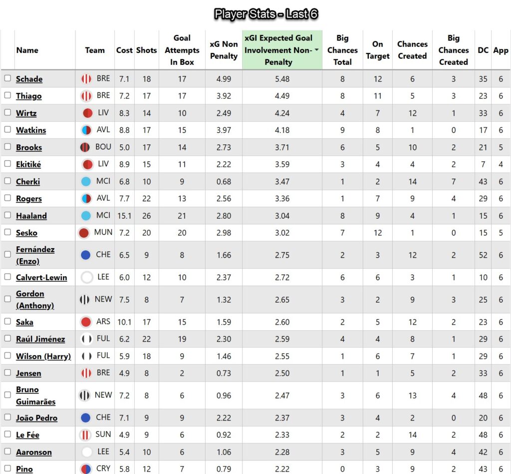 I think that Foden’s half-time substitution in the Manchester derby was due to an injury to his hand, rather than something performance-related. The England international still started in midweek against Bodo/Glimt, and like most other Manchester City players, he had a poor night. The underlying numbers for Foden have plummeted as well. As you can see in the image below, he is not in the top 20 players for non-penalty expected goal involvement (NPxGI) over the last six Gameweeks.