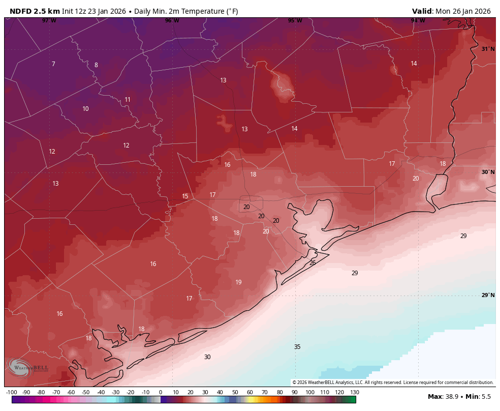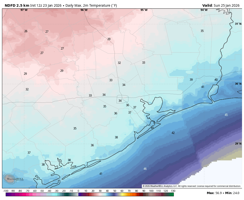 We remain highly confident in temperatures plunging on Sunday night, probably down to the 20-25 degree range in urban Houston, with conditions a little warmer closer to the coast, and a little cooler in places like Katy and The Woodlands (15 to 25 degrees). Note there still is some uncertainty about how cold it will get.