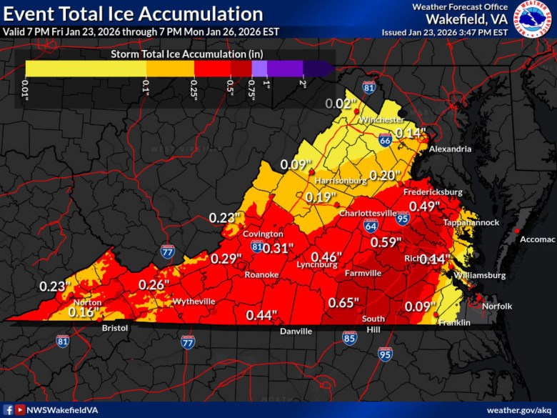 Every inch of the commonwealth is expected to see at least some wintry precipitation Saturday evening through the predawn hours of Monday morning, with most of the state seeing impactful totals of snow, sleet and freezing rain that will stall travel and raise the potential of scattered to numerous power outages, especially where ice is the thickest. Gov. Abigail Spanberger declared a state of emergency ahead of the winter storm on Thursday to mobilize resources for response.