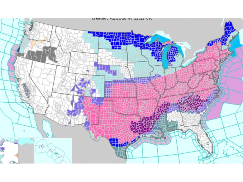 The pink represents winter storm warnings stretching from Texas to New England, including all of Virginia, as a large storm system sprays moisture into Arctic air advancing southward, leading to widespread snow, sleet and freezing rain over much of the central and eastern U.S. Courtesy of National Weather Service.