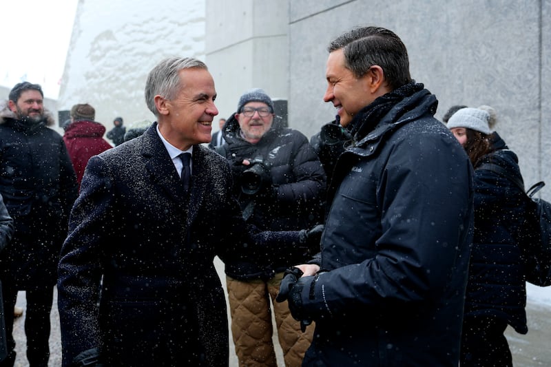 Mark Carney and Pierre Poilievre Prime Minister Mark Carney greets Conservative Leader Pierre Poilievre as they arrive at an International Holocaust Remembrance Day event at the National Holocaust Memorial in Ottawa, on Tuesday, Jan. 27, 2026. THE CANADIAN PRESS/Justin Tang