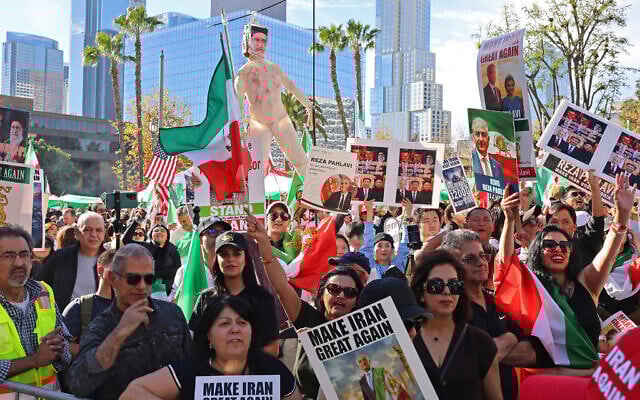 Protesters hold flags and placards during a rally in solidarity with protesters in Iran, in Los Angeles on January 18, 2026. (Jonathan Alcorn / AFP)
