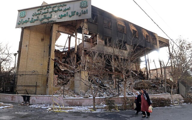 This photograph taken during a tour for foreign media shows women walking past a government building that was burnt during recent public protests, in Tehran on January 21, 2026. (ATTA KENARE / AFP)