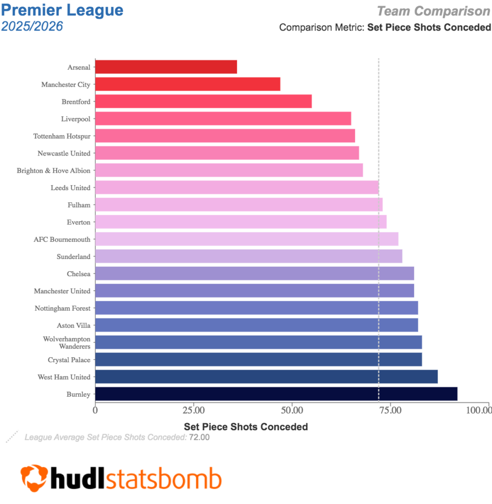 Another player benched in midweek, Trevoh Chalobah (£5.7m) gets the nod as Chelsea welcome rivals West Ham United to Stamford Bridge. The centre-back has served up 12 points in his two matches under Liam Rosenior thus far, banking DefCon on both occasions. Nuno Espirito Santo’s men are rock-bottom for headed chances allowed and 19th for efforts from set plays conceded (see image below), so Chalobah could get some joy from such situations.