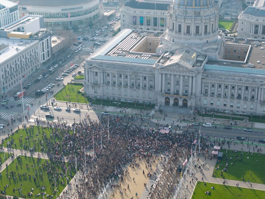 “ICE Out” protest at San Francisco City Hall on Friday. Photo by Vincent Woo.
