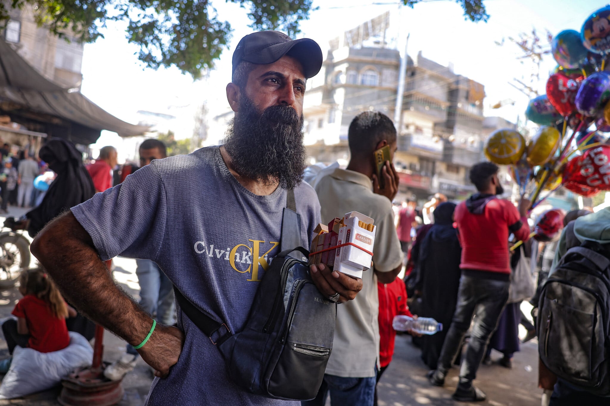 A Palestinian man sells cigarettes at a market in Deir el-Balah in the central Gaza Strip, October 18, 2025. (Bashar TALEB / AFP)