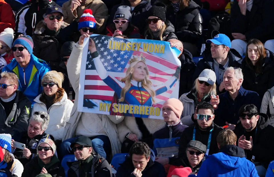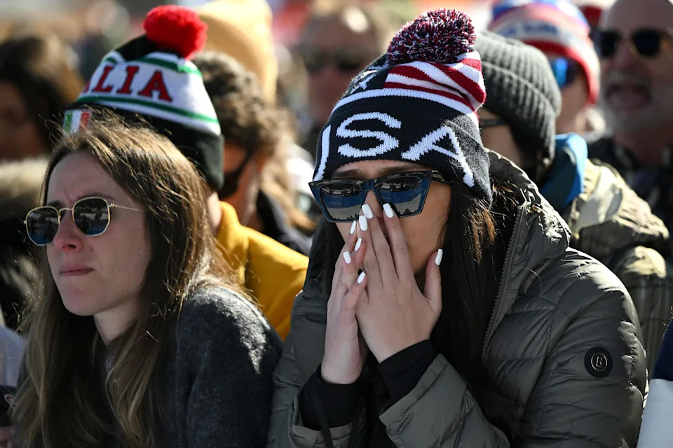 Lindsey Vonn supporters react after Vonn’s crash during the women’s downhill race at the 2026 Olympic Winter Games at the Tofane Alpine Skiing Centre in Cortina d’Ampezzo on Feb. 8, 2026.