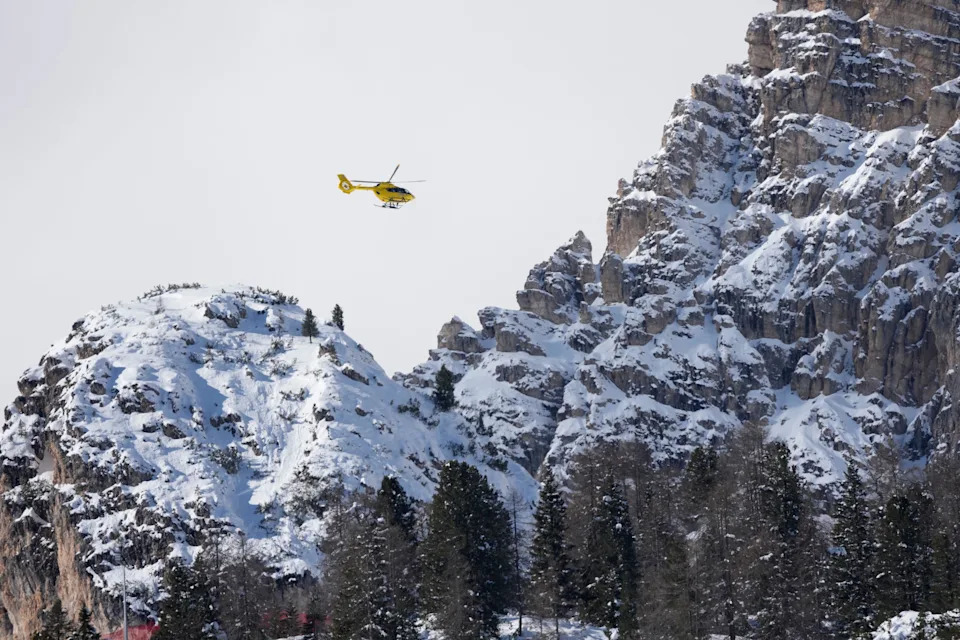 A helicopter arrives on the ski course to airlift Lindsey Vonn following her crash in the women’s downhill event at the 2026 Winter Olympic Games at the Tofane Alpine Skiing Centre in Cortina d’Ampezzo on Feb. 8, 2026.