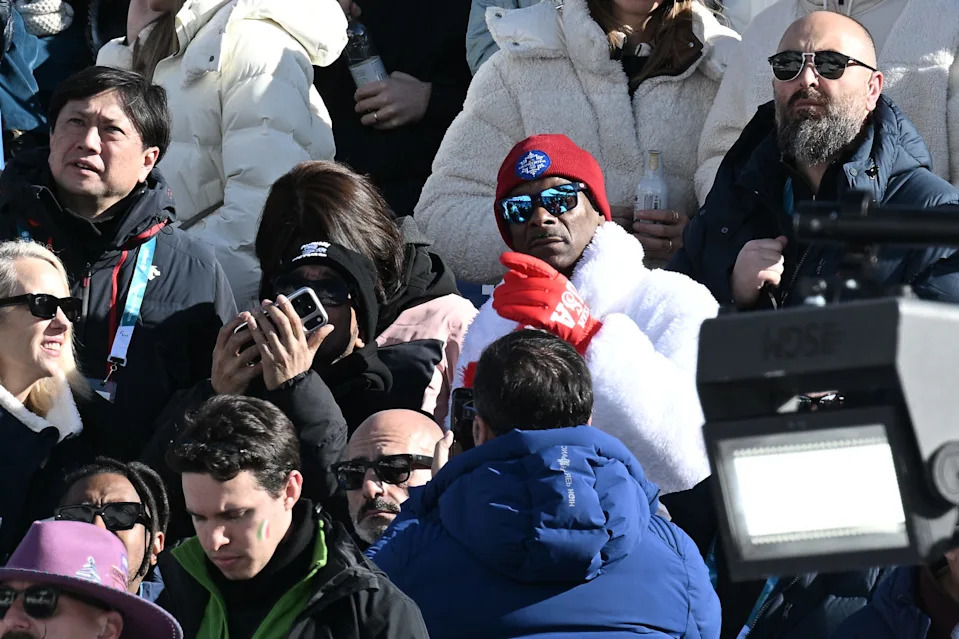 Snoop Dogg reacts to the crash by American skier Lindsey Vonn during the women’s downhill at the 2026 Winter Olympic Games at the Tofane Alpine Skiing Centre in Cortina d’Ampezzo on Feb. 8, 2026.