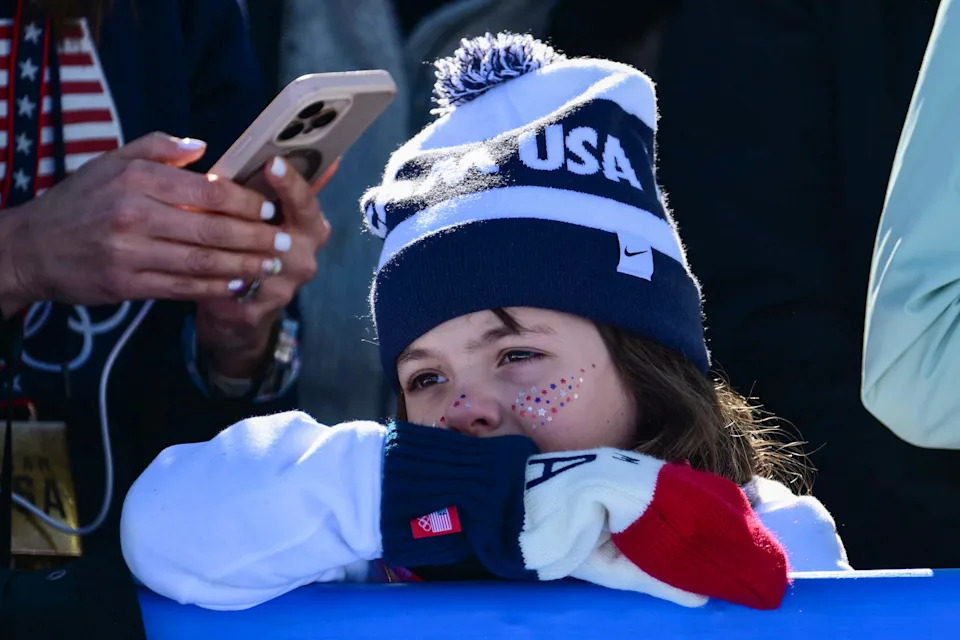 A Team USA supporter reacts after Lindsey Vonn crashed and was evacuated by helicopter in the women’s downhill event at the 2026 Winter Olympic Games at the Tofane Alpine Skiing Centre in Cortina d’Ampezzo on Feb. 8, 2026.