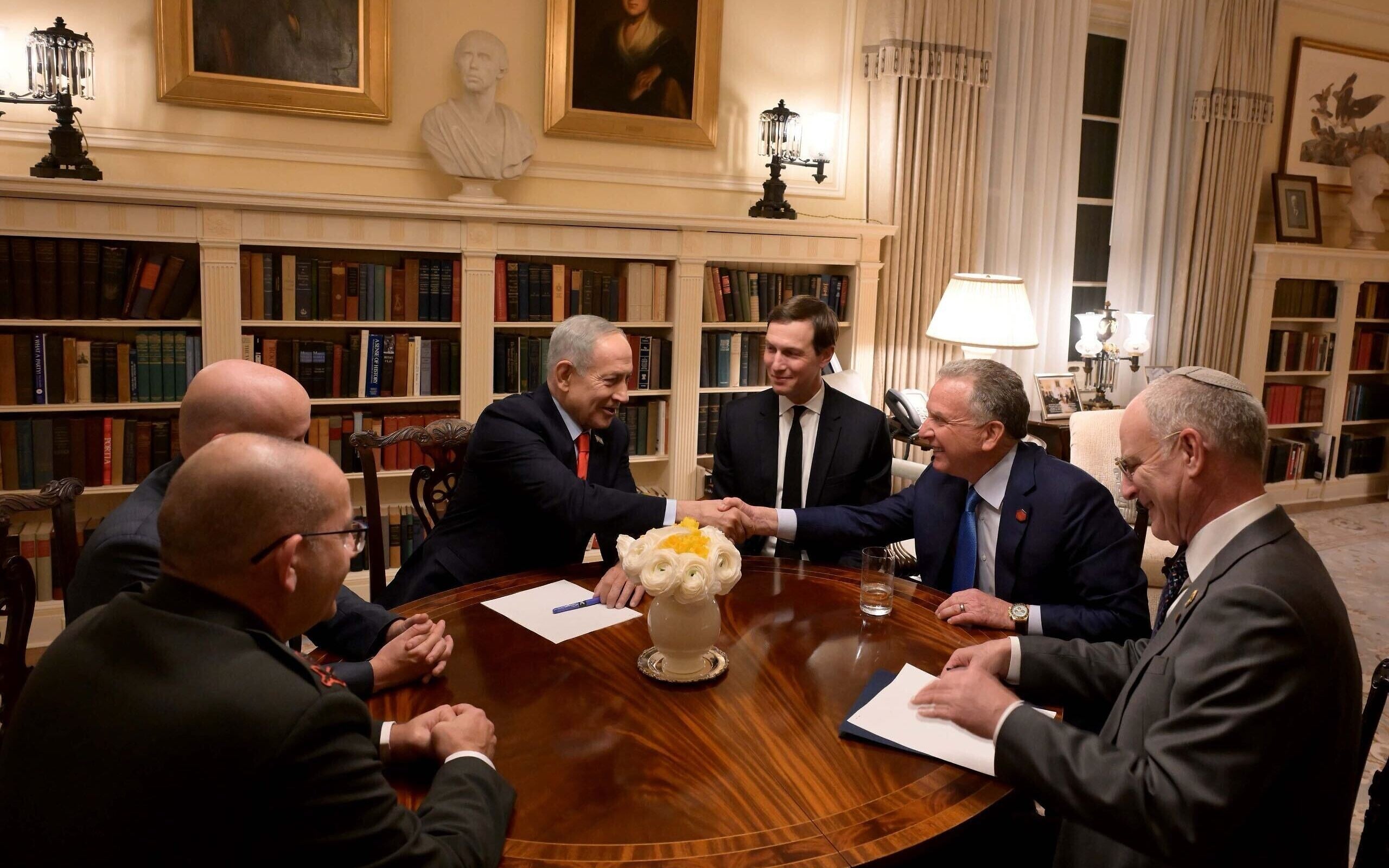 Prime Minister Benjamin Netanyahu (3rd-L) meets with US President Donald Trump’s senior aides Steve Witkoff (2nd-R) and Jared Kushner (3rd-R) at Blair House in Washington, February 10, 2026. (Avi Ohayon/GPO)