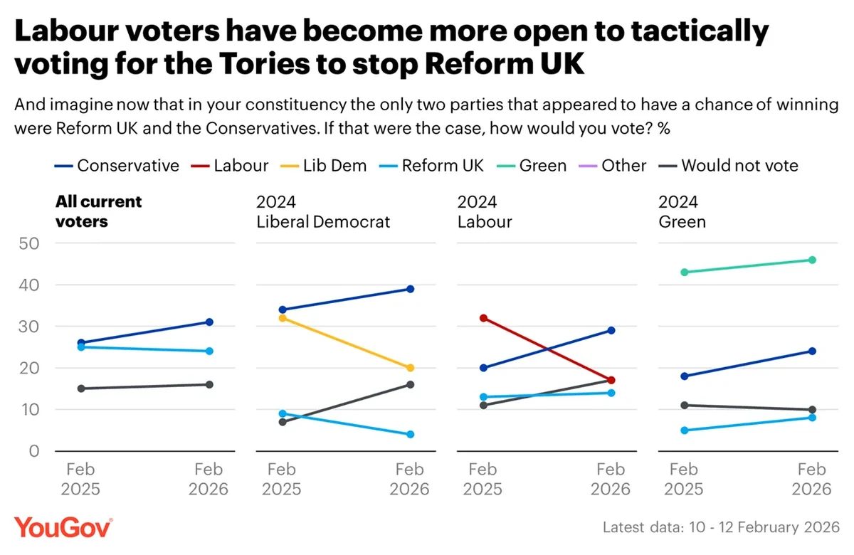 Around three quarters (76-77%) would instead switch to either the Lib Dems or Greens to try to stop Reform UK winning their seat, while 63-69% would tactically vote Lib Dem or Green in two-way contests between them and the Conservatives.