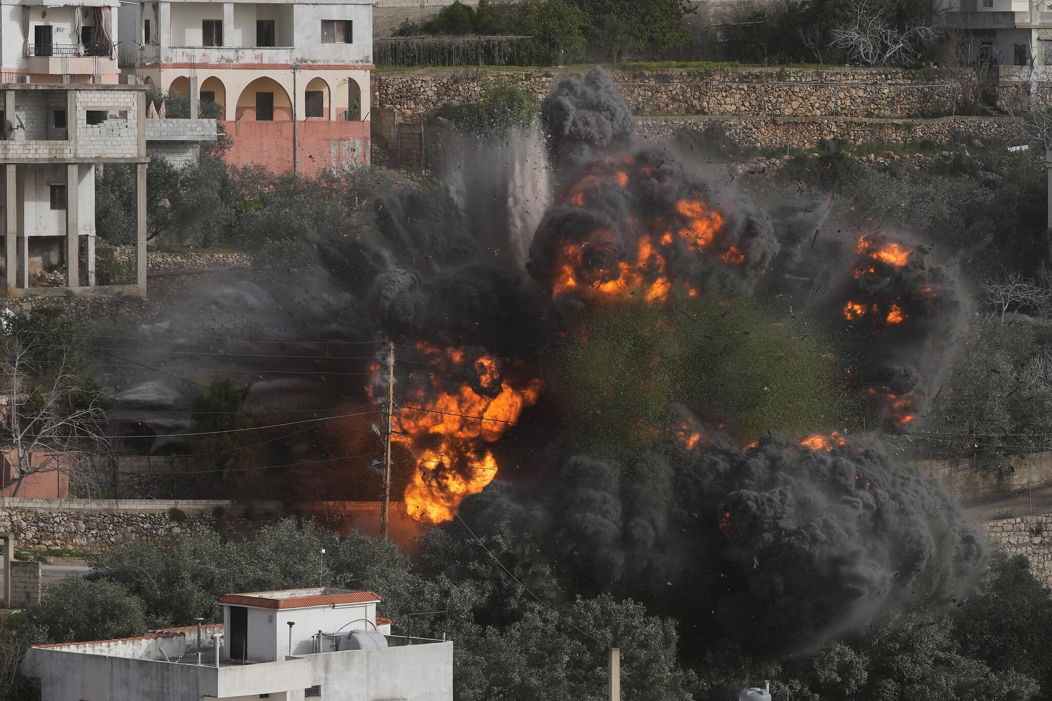 Flames and smoke rise from a building that was hit by an Israeli airstrike in Ain Qana, southern Lebanon, February 2, 2026. (AP Photo/Mohammed Zaatari)