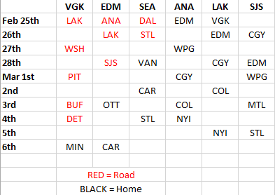 Here’s a quick look at games involving the six Pacific Division teams leading up to the trade deadline. Edmonton and Vegas have home games the evening of the March 6th deadline.