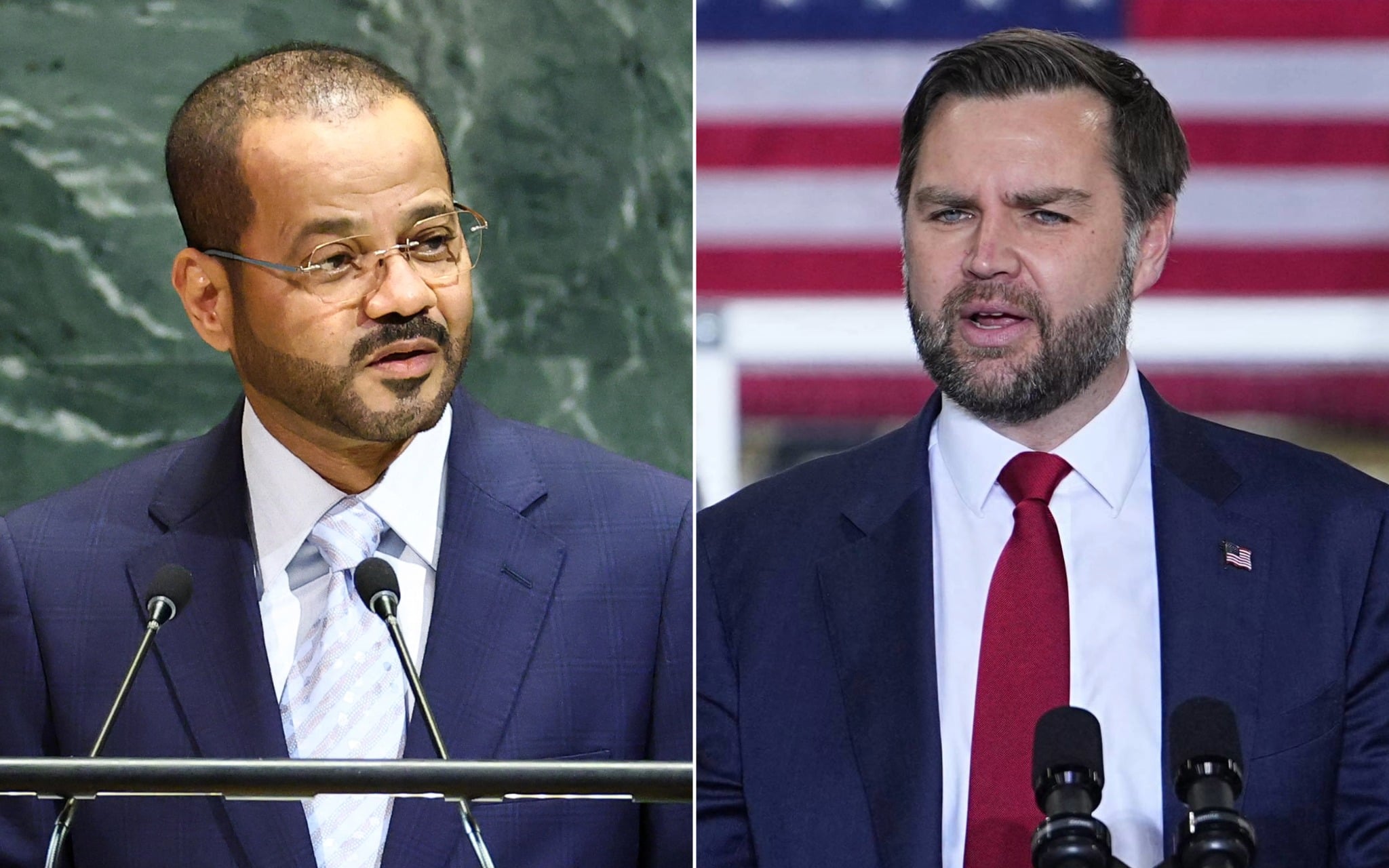 Left: Oman’s Foreign Minister Sayyid Badr Albusaidi addresses the United Nations General Assembly at UN headquarters in New York City on September 27, 2025. (CHARLY TRIBALLEAU / AFP); Right: US Vice President JD Vance speaks as he visits Pointe Precision, a machining facility in Plover, Wisconsin, on February 26, 2026. (Matt Rourke / POOL / AFP)