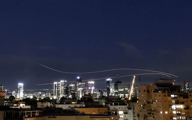 This long exposure shows trails from interceptions over central Israel on February 28, 2026. (Photo by JACK GUEZ / AFP)
